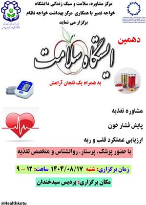دهمین ایستگاه سلامت با هدف اندازه گیری قند، فشار خون و مشاوره تغذیه، روانشناسی و پایش سلامت قلب و ریه 17 آبان ماه در پردیس سیدخندان از ساعت 9 تا 12 برگزار شد.